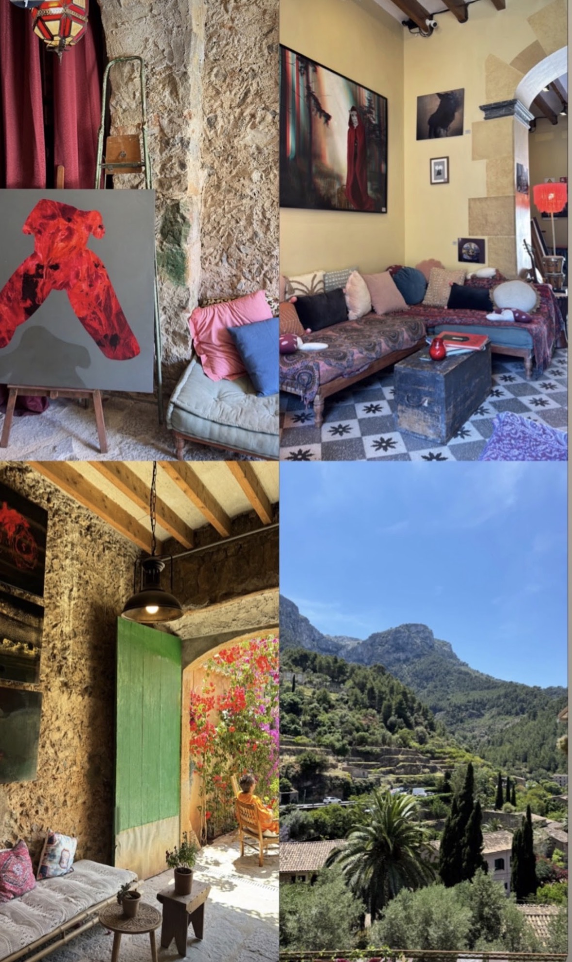 Mushroom Gallery Bar is situated in a traditional Mallorcan residence, restored back to its former glory. It’s the ideal setting for paintings of the national and international artists. You can find us on the main road in the bohemian mountain village of Deià on the northwest coast of Mallorca in Spain, where it sits dramatically between the Serra de Tramuntana Mountains, declared a UNESCO World Heritage Site and the Mediterranean Sea, which gives it one of the most striking landscapes in the Balearic Islands. Deià became internationally famous in the 20th century as an artist’ colony when poet Robert Graves settled here.